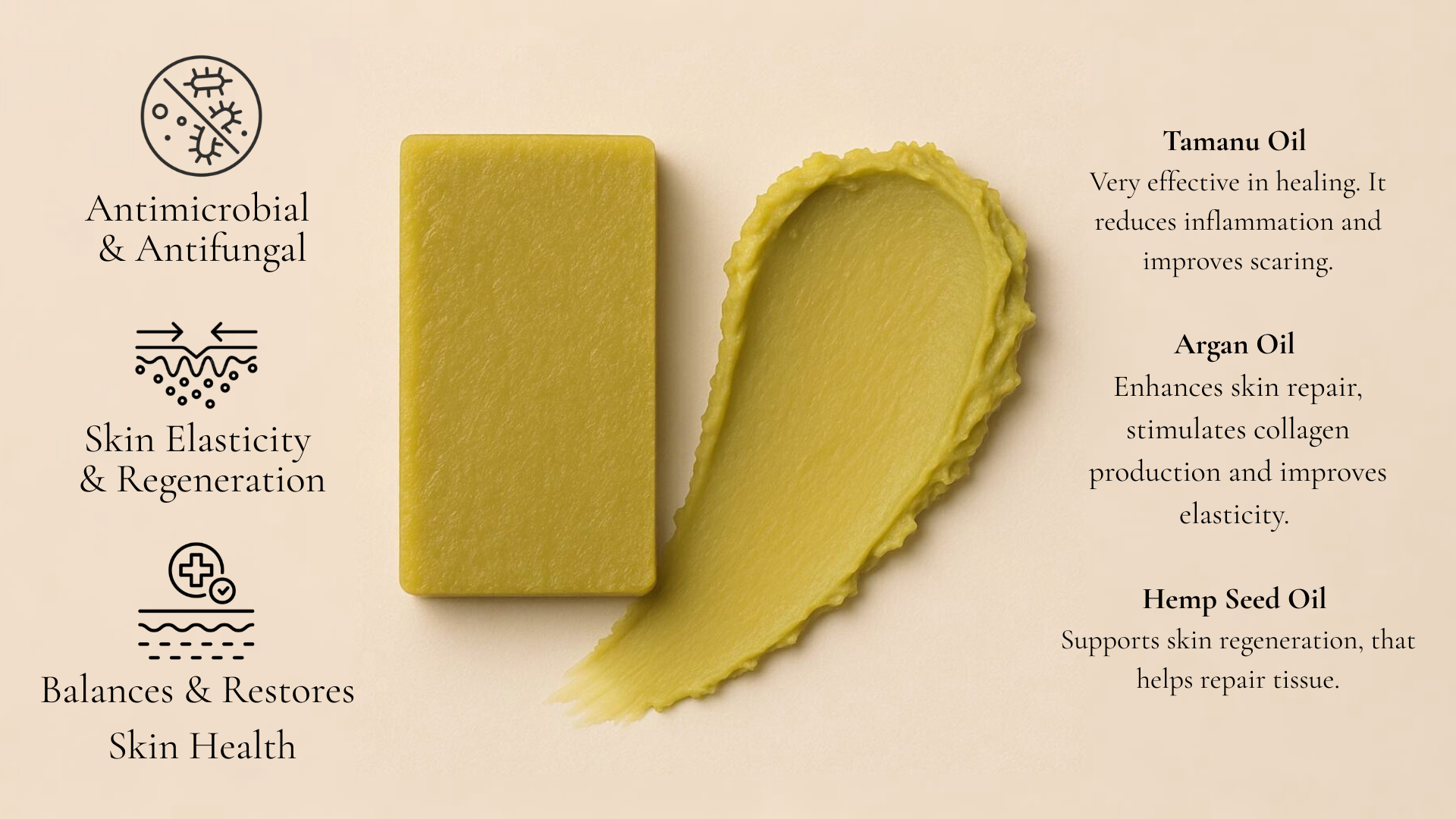 Enriched with Hemp Seed and Tamanu Oils to soothe and repair, Argan Oil and Vitamin E to enhance elasticity. Perfect for anyone looking to repair their skin!
